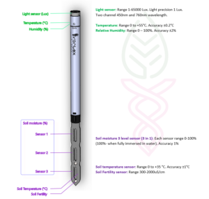 • Soil fertility sensor: 300 – 2000 uS/cm. Accuracy ±5%
