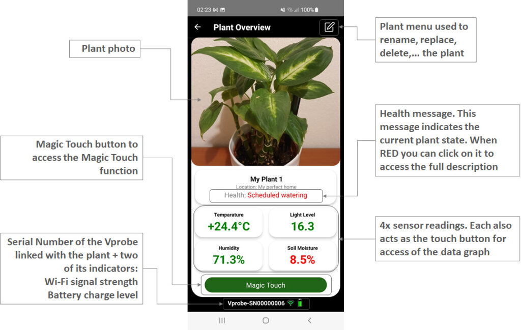 - The Vprobe plant sensor learns and ajusts to your plant’s unique needs, providing tailored care and recommendations for optimal growth.