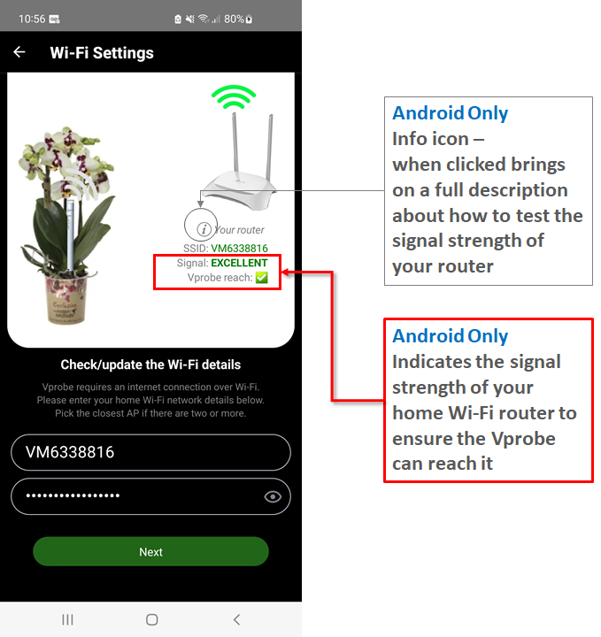 On the Android platform, it’s possible to test your home Wi-Fi coverage (signal strength) to ensure the signal is good enough for the Vprobe to communicate reliably. You can use this simple tool to test the signal strength in different locations around your home by moving the phone and checking the status. The signal strength around the plant pot must be shown as PERFECT, EXCELLENT, GOOD or at least FAIR for the Vprobe to reach the router (internet access point). Click on the info icon in the App to access a full description.